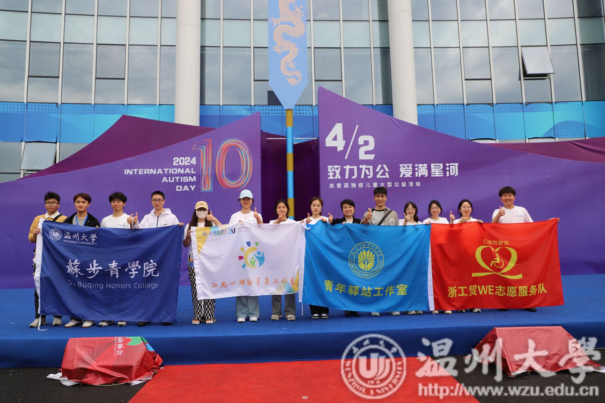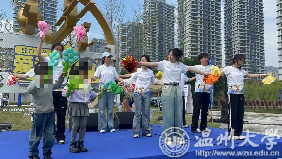 3月30日,在第十七个“世界孤独症关注日”来临之际,由益起行组织发起的“致力为公,爱满星河”关爱孤独症儿童大型公益活动现场,大学生助残志愿服务队在温州市龙舟运动中心,给300户孤独症家庭提供韵律啦啦操课堂体验。