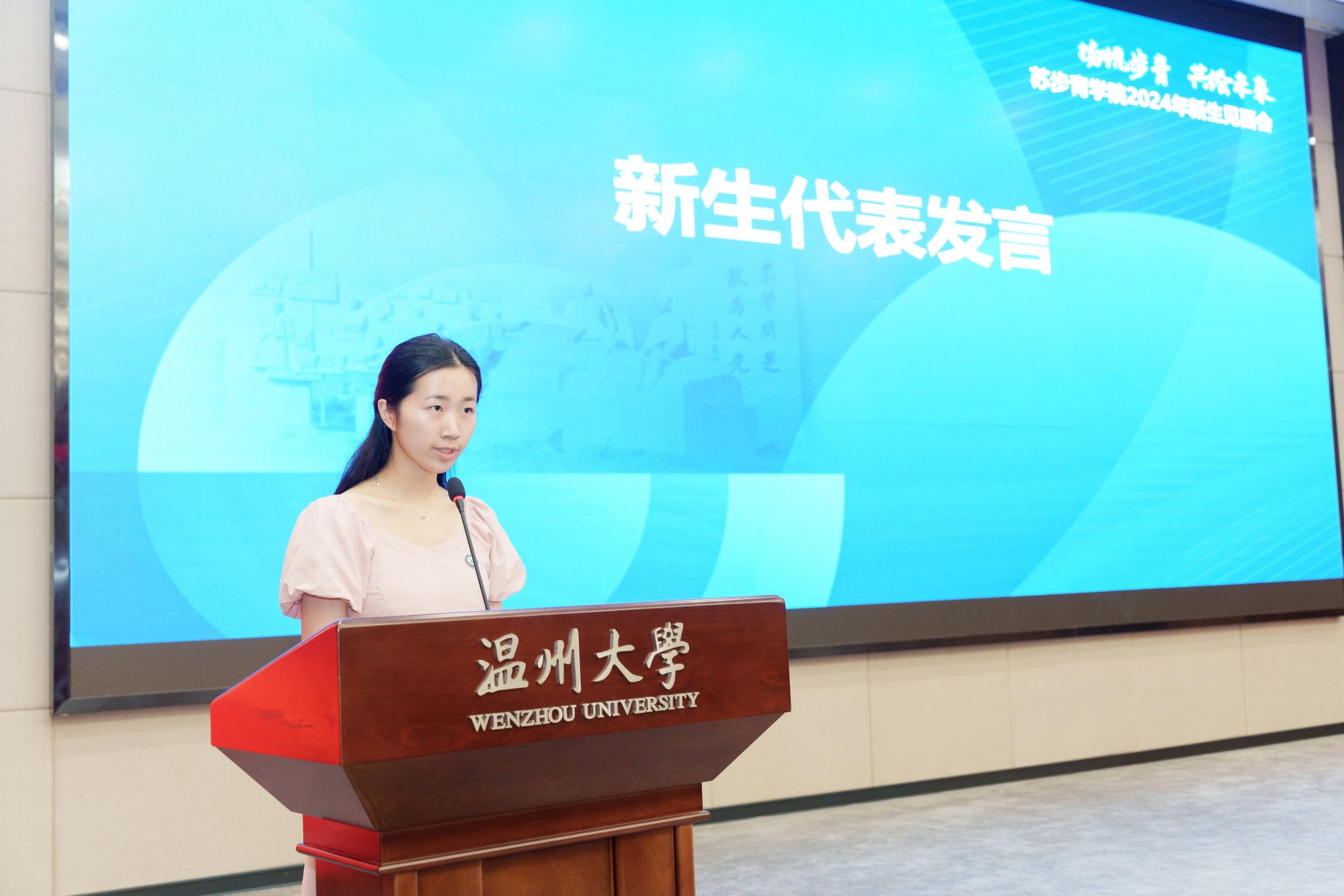 汉语言文学实验班胡紫依同学代表新生发言。她代表全体24级步青新生向学院表达了诚挚的感谢,并表示将始终牢记“志存高远、励学笃行”的院训,努力学习知识,提升能力素养,为成为具有全球视野、深厚素养、家国情怀的复合英才而努力奋斗。