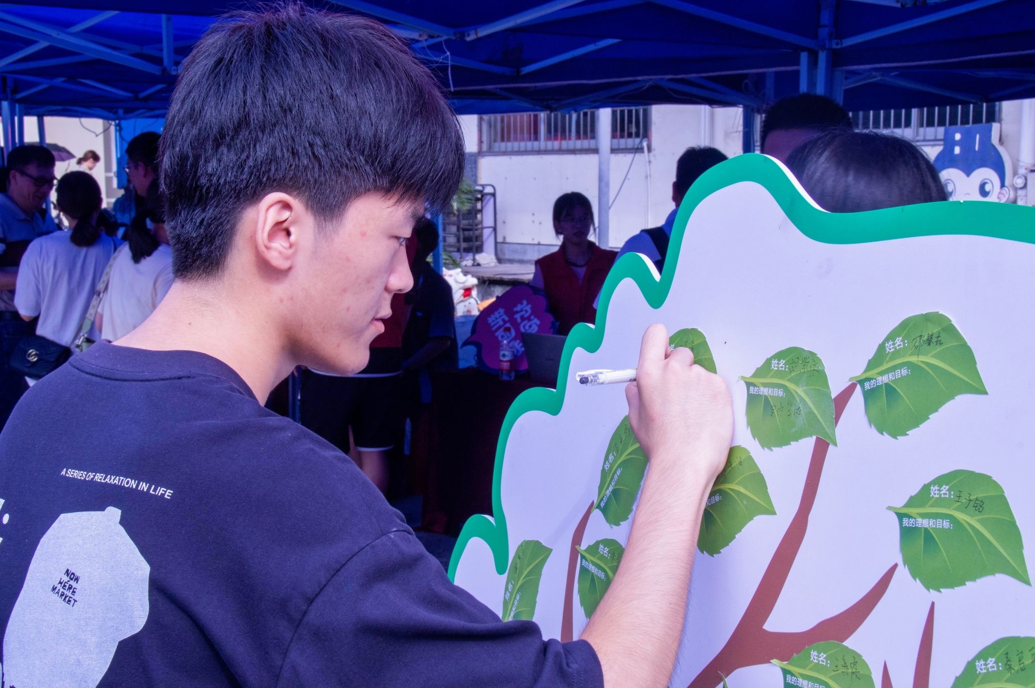在新生报到现场,学院设置了创意签到环节,每一位新生都被邀请在绿色的叶形纸片上签上姓名,并写下自己的目标和理想。这些承载着新生梦想与希望的纸片随后被构建成一棵“步青常青树”,寓意新生们的梦想将与学院共同成长,枝繁叶茂。这一创意环节不仅让新生们感受到了学院的温暖与关怀,也激发了他们对未来大学生活的无限憧憬。