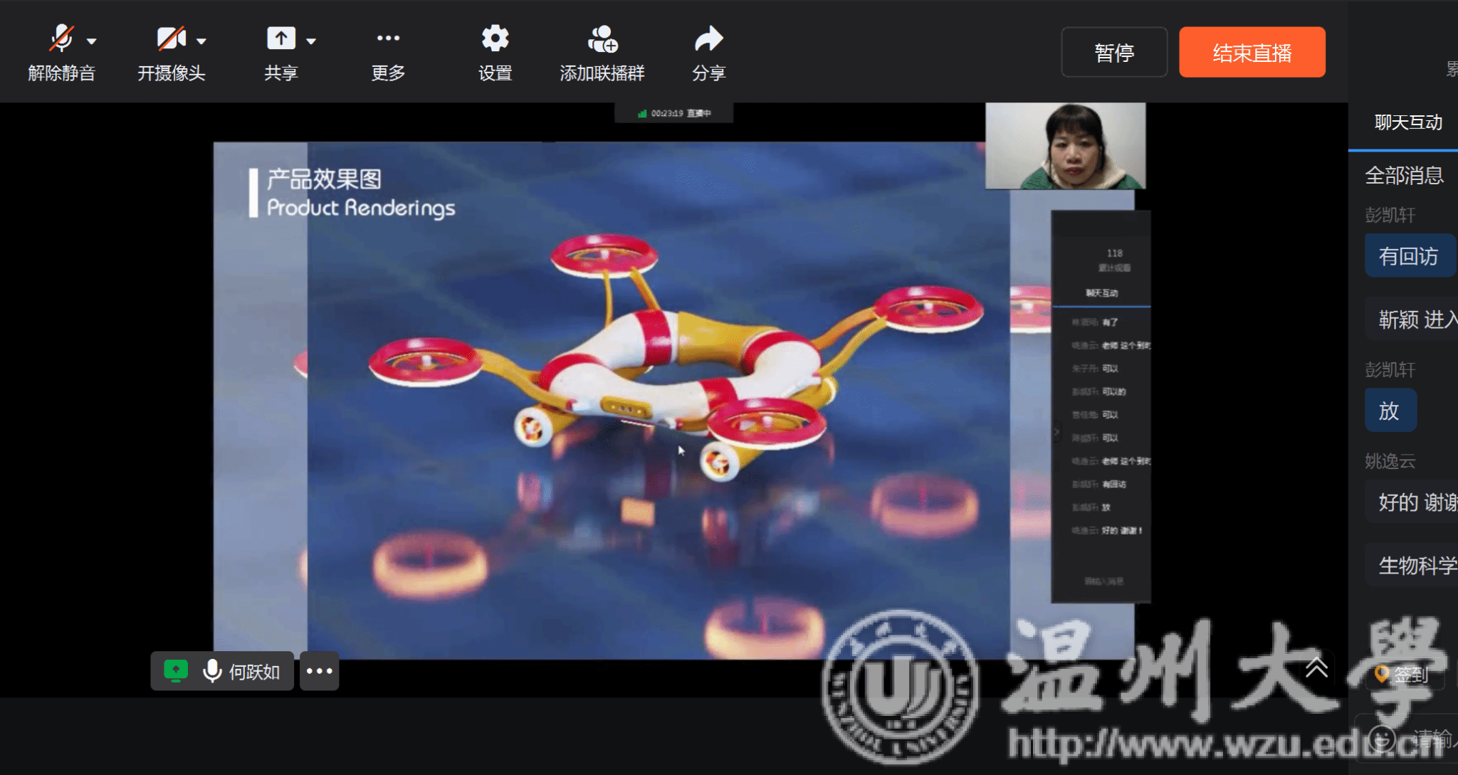 讲座的高潮部分是比赛过程的介绍。通过案例展示,从初赛选题到调研、草图设计、建模渲染再到最后产出创意说明以及1分钟产品动画,为同学们展示了一个完整的创意设计过程。讲座还展示了“水域无人巡检救援机器人”、“陪伴型机器人小Q”、“居家购物车机器人”、“智能厨余垃圾处理机器人”等获得一等奖的作品。