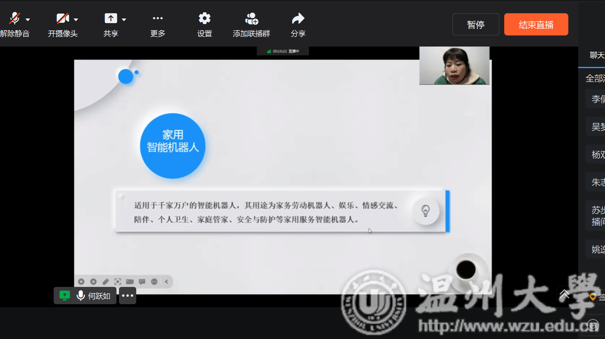 于1月29日晚举办了本次冬令营科创板块的第二场讲座——大学生智能机器人创意竞赛指导讲座。本次讲座特邀温州理工学院设计艺术学院的智能机器人创意指导教师团队的何跃如老师主讲。