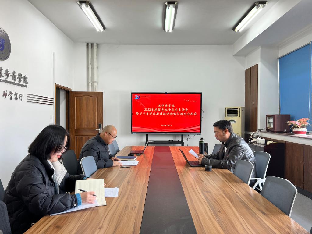 召开2022年度领导班子民主生活会暨下半年党风廉政建设和意识形态分析会,学院党政领导班子成员参加会议。会议由党总支书记应中主持。