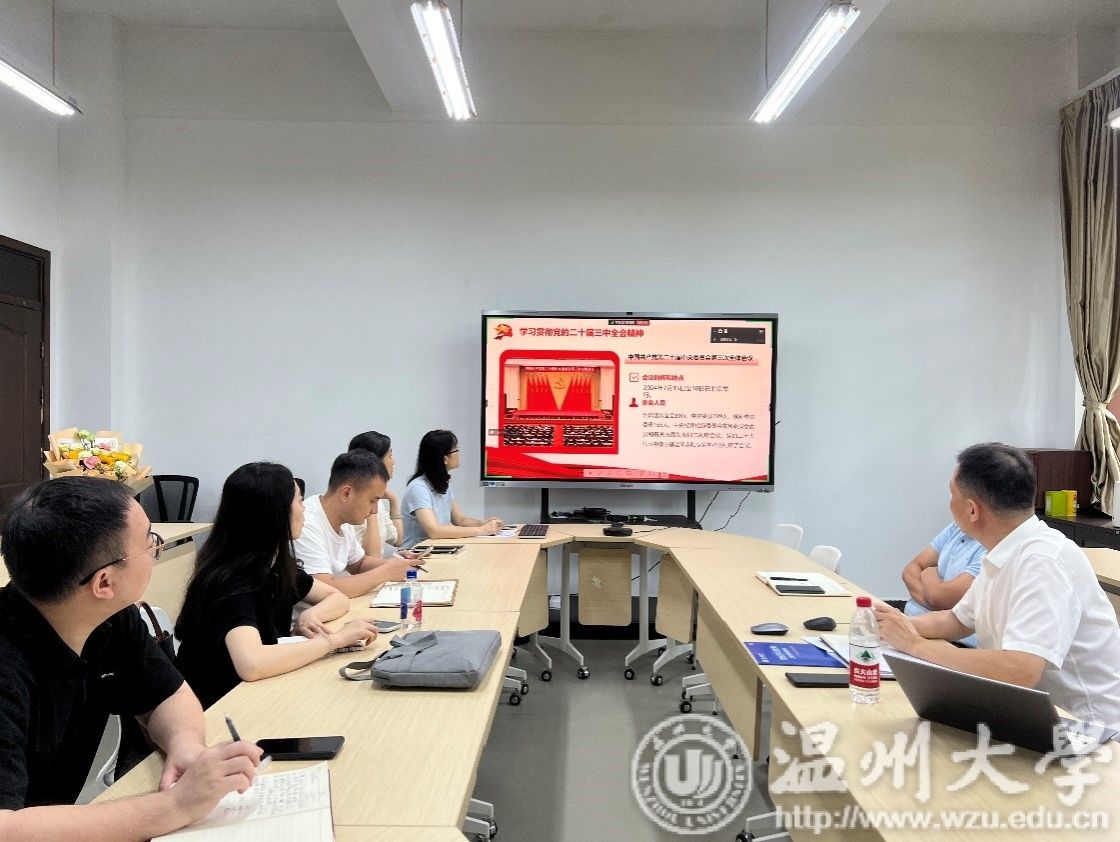 全体教职工在瓯4-109召开学习贯彻党的二十届三中全会精神专题会,贯彻落实省委、市委和学校党委的部署要求,研究部署学院贯彻落实工作。