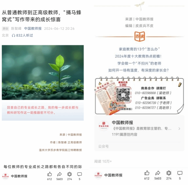 陈智峰教授的《“捅马蜂窝式”写作带来的成长惊喜》一文于6月12日在教育部主管、国家主流教育媒体《中国教师报》“名师”版发表后,《中国教师报》公众号当天予以推送,目前阅读人数已达10万+,并引发了热议。