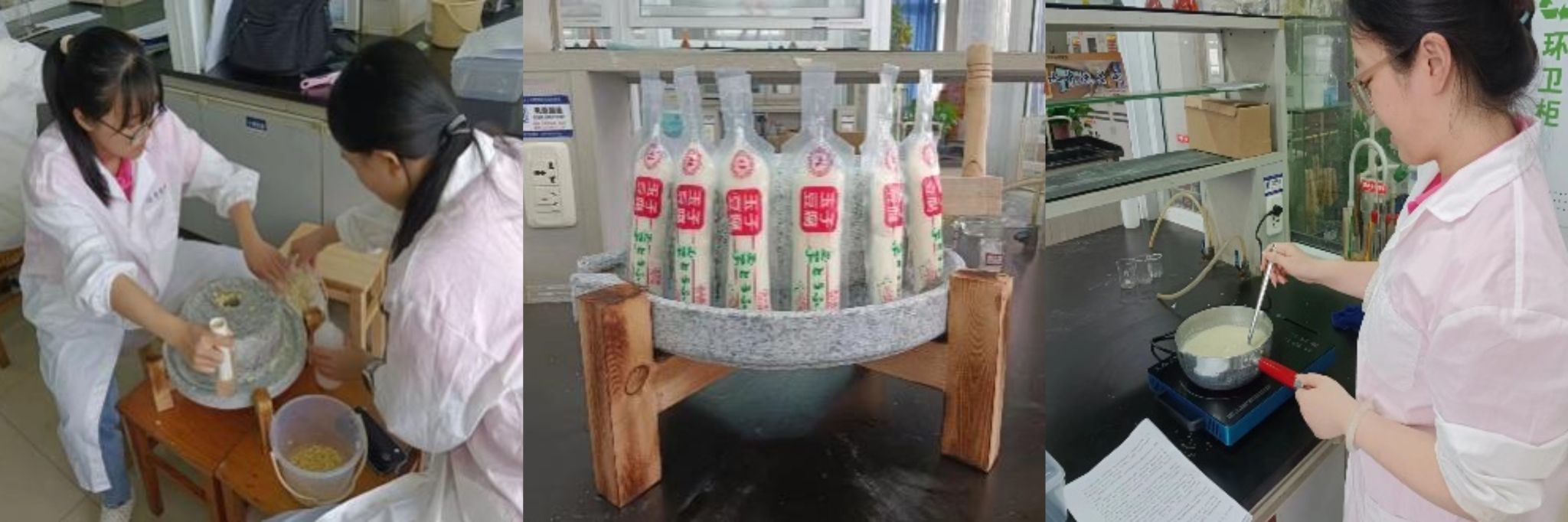溯初学员们沉浸在选豆、浸泡、磨浆、煮浆、点卤、凝固、成型的传统制作仪式中,仿佛穿越回了千年前的农耕岁月,与古人一同体验传统技艺的奇迹。手握石磨,手臂缓缓转动,豆粒在磨盘间轻轻吟唱,释放出久违的醇香,宛如大自然最质朴的馈赠。这不仅是一次对耐心与细心的考验,更是一场对传统技艺的致敬。从黄豆到豆浆,再到那令人垂涎欲滴的玉子豆腐,每一步都体现着匠人精神,每一次转变都承载着对美好生活的追求与向往。