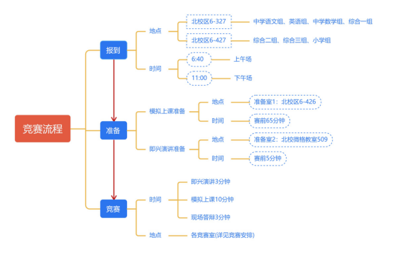 所有选手提前进入等待室进行赛前准备,然后按规定时间到准备室1根据模拟上课试题,准备60分钟(如有制作课件需将课件传至指定FTP,并在教师机上确认可以打开后签字离开准备室1);然后再到准备室2根据即席讲演试题,准备5分钟(离开准备室时需交回讲演试题);最后到竞赛室开始比赛。每个选手竞赛时间为16分钟(其中3分钟即兴演讲,10分钟模拟上课,3分钟现场答辩),选手间交接时间为2分钟左右。