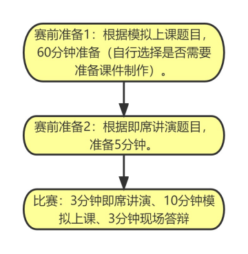 每位选手赛前准备时间共计65分钟,其中模拟上课准备时间为60分钟,即席讲演准备时间为5分钟。每位选手正式比赛时间为16分钟,其中即席讲演时间为3分钟,模拟上课时间为10分钟,现场答辩时间为3分钟。每位选手进入竞赛室后,先进行即席讲演,然后开始模拟上课,最后进行现场答辩。每个项目在结束前一分钟都会有工作人员举黄牌提醒、时间到工作人员会中断比赛。