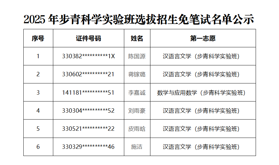 2025年步青科学实验班选拔招生免笔试名单公示