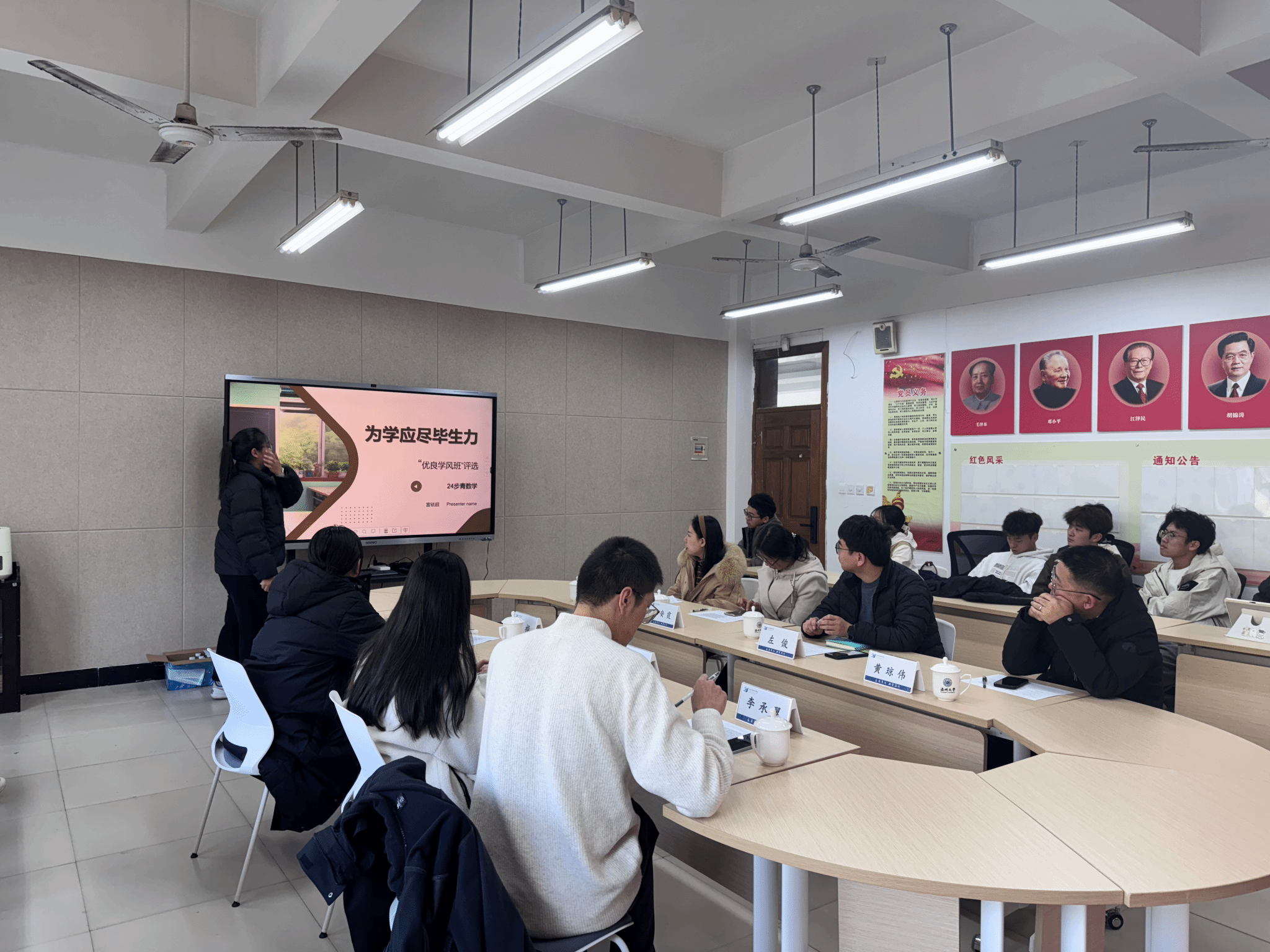 活动伊始,李承翼对优良学风班建设的意义进行了详细阐述,指出学风是高校教育的灵魂,是学生成长的重要基石。评审分为班级建设展示和老师评审两个环节,评审标准围绕“学业水平”“班级风气”“考勤纪律”等维度,对各班级的表现进行综合考量。