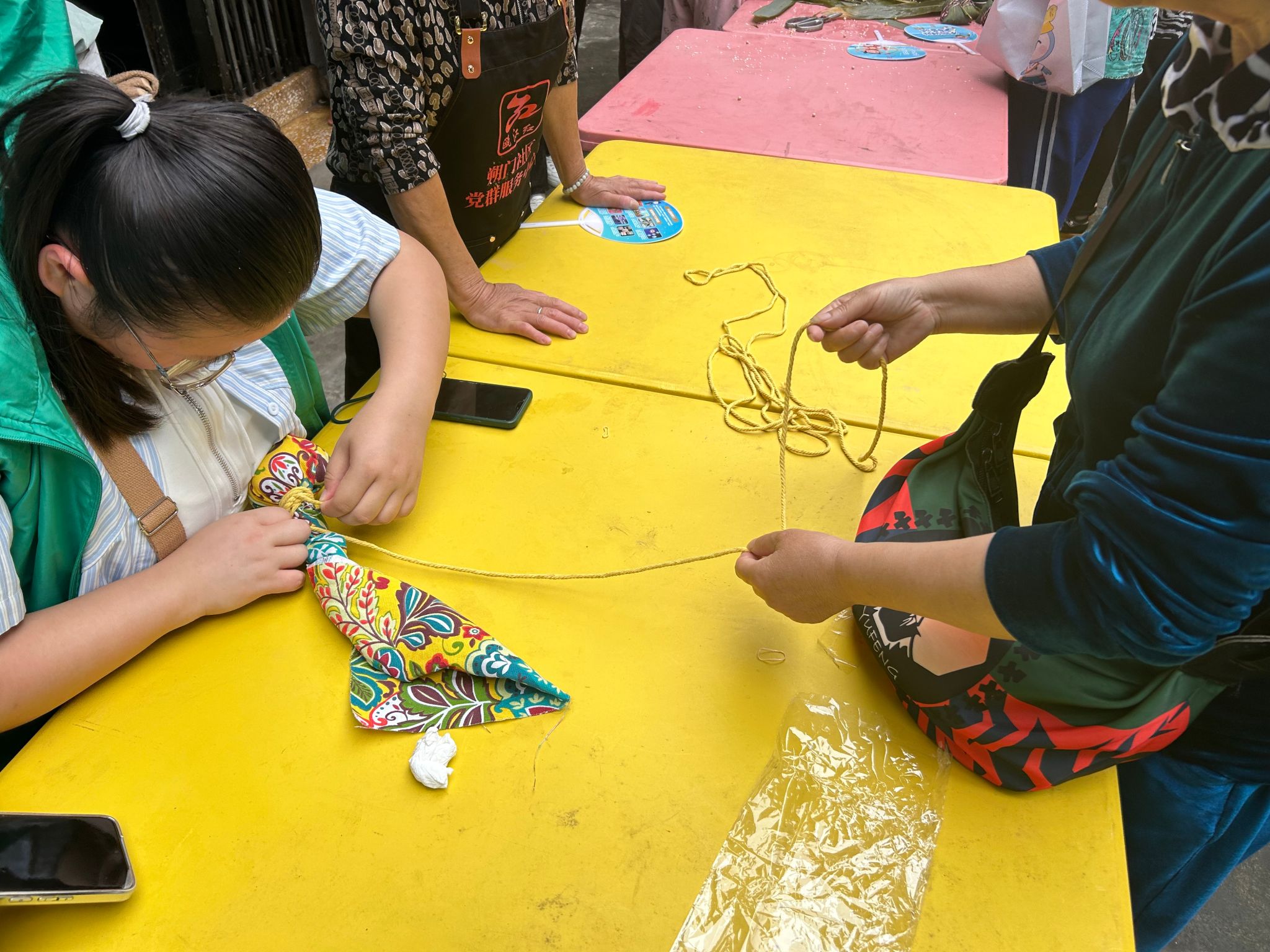 活动现场节日氛围浓厚,艾香四溢。在经验丰富的 “青心”志愿者们的悉心引导下,社区居民兴致盎然地投入到特色手工体验中。巧手翻飞,编织出承载美好祈愿的玲珑艾草香囊;细心锤裹,制作着蕴含传统智慧的养生艾草锤。志愿者们耐心讲解、示范协助,将看似复杂的工艺化为居民手中的温馨成果,其专业与热忱的服务态度,正是“青心”志愿服务队精神的生动体现。与此同时,编蛋袋、包粽子、趣味撞蛋等经典端午项目也同步进行,现场欢声笑语不断,邻里情谊在互动中悄然加深。