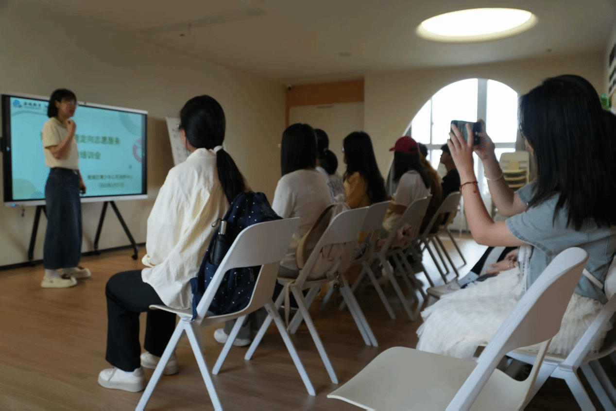 参观结束后,实践队成员来到培训教室。唐老师向实践队成员进行了入社科普介绍,她首先介绍了“心巴士”暑期活动的背景和目标,强调了通过心理教育活动帮助青少年建立积极心态、提升心理韧性的重要意义。随后,唐老师结合实际案例,传授了与小朋友相处的技巧与方法,包括如何建立信任关系、如何引导情绪表达等。培训过程中,队员们积极参与互动,现场气氛热烈而融洽。